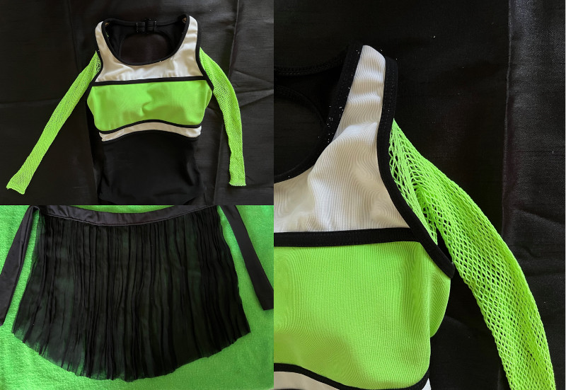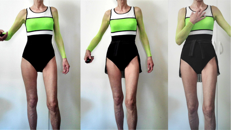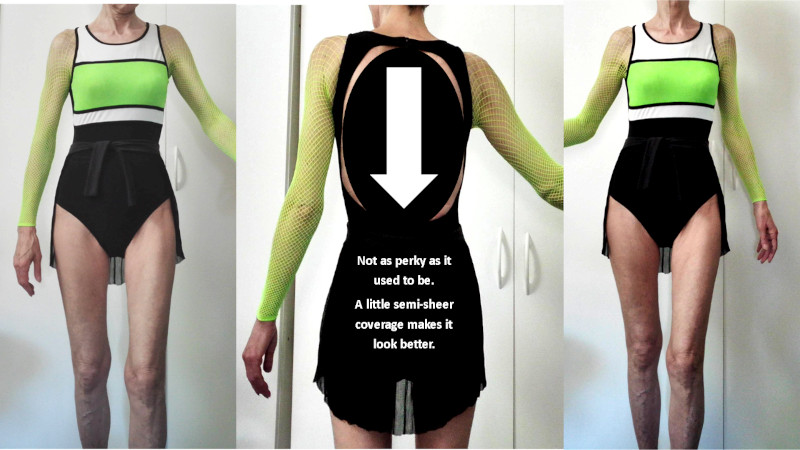 The ugly arms… Well, I’m a smart shopper who occasionally buys stuff that’s on sale for a good reason, and sometimes without. I happened to own a pair of stretchy, neon-green net pantyhose that I’d never wear. I cut off the legs and attached them to the openings on the swimsuit’s arms. The swimsuit looked better on me.